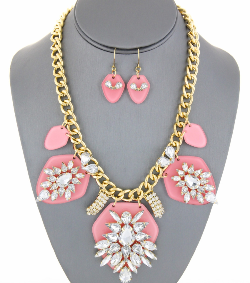 Acrylic bib necklace with crystal jewel detailing.